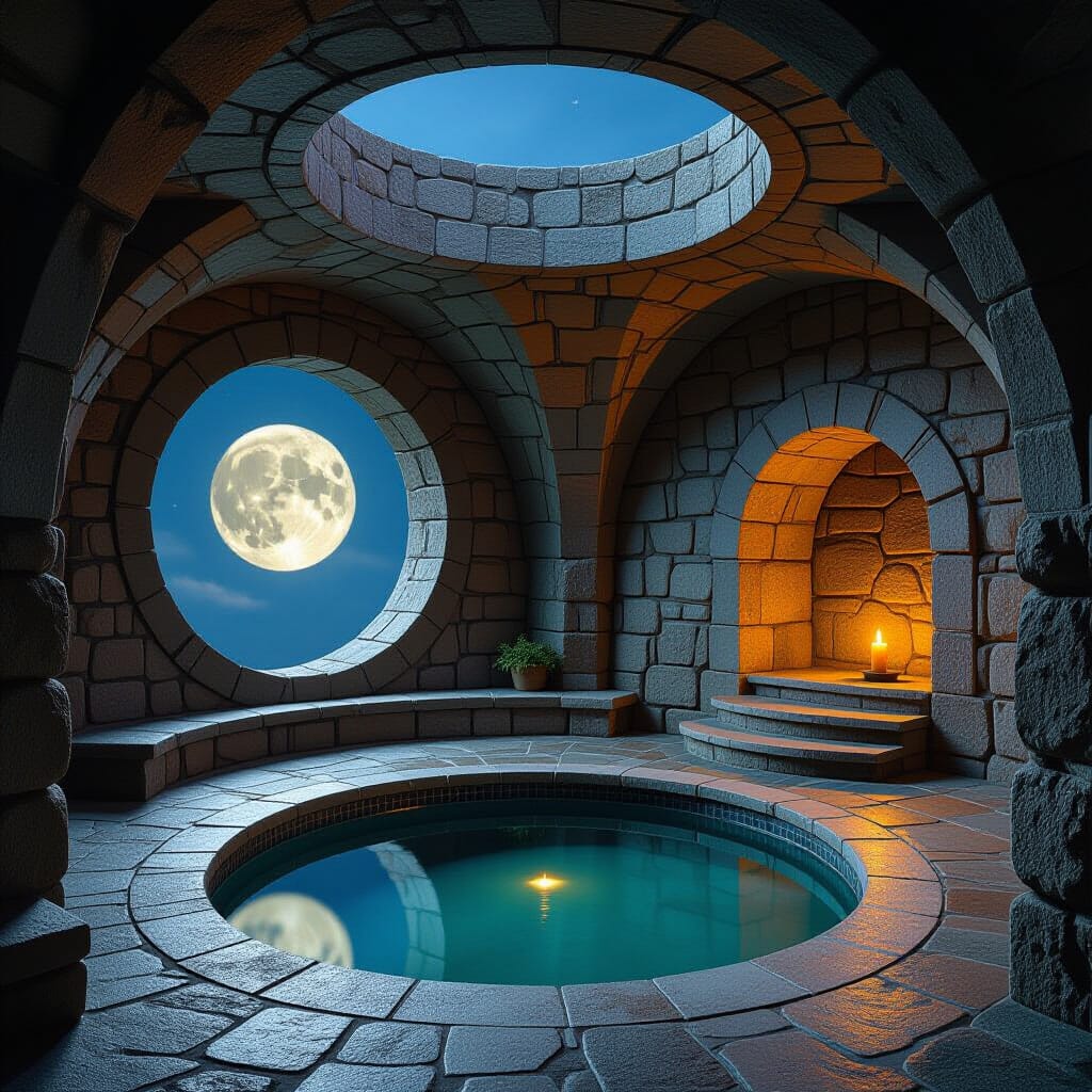 I am standing upon a stone walkway surrounding a tiled round reflecting pool. The full moon is visible upon its surface, illuminating the chamber from a hole in the ceiling.