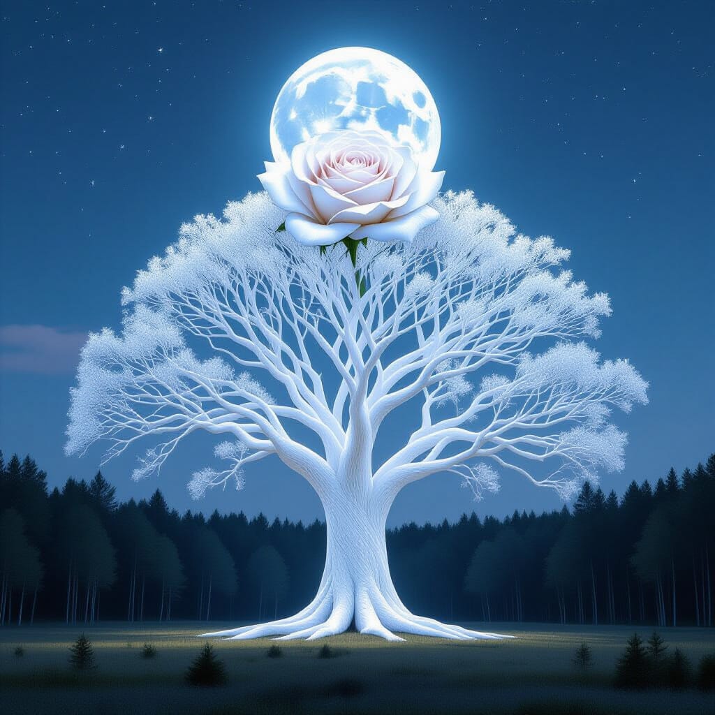 It sets itself upright upon the ground here, the moon brightening this wooden cathedral from the hole at the top, and begins to grow. The stem reaches up and up and up, past the branches which retreat to give it space, and its flower expands to cover the hole.