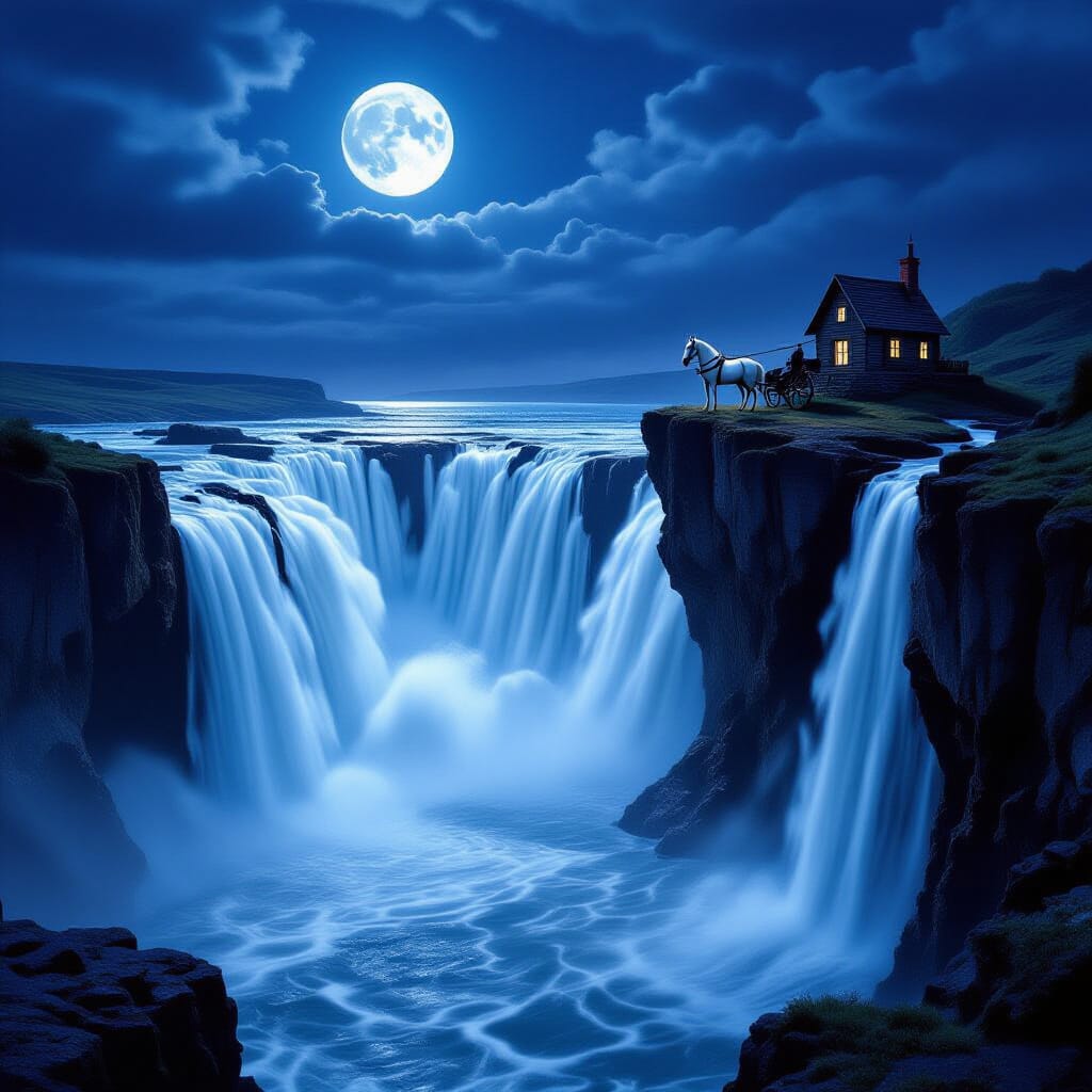 Partway down the falls, upon a small cliff, rests a cottage.