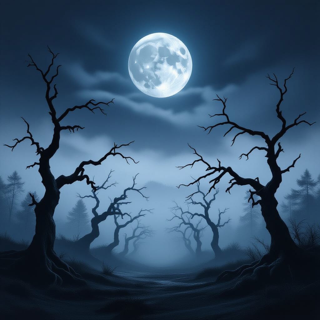 Outside below the Moon, rows of black, gnarled, dead trees reach their branches upward as if trying to escape the fog that hangs low and still upon the ground.