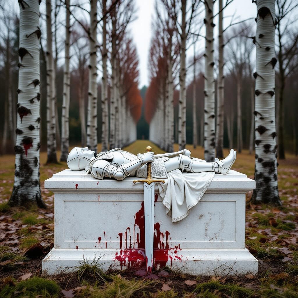 Scars in the wood pour forth a deep red sap, like fresh blood on recently fallen snow.